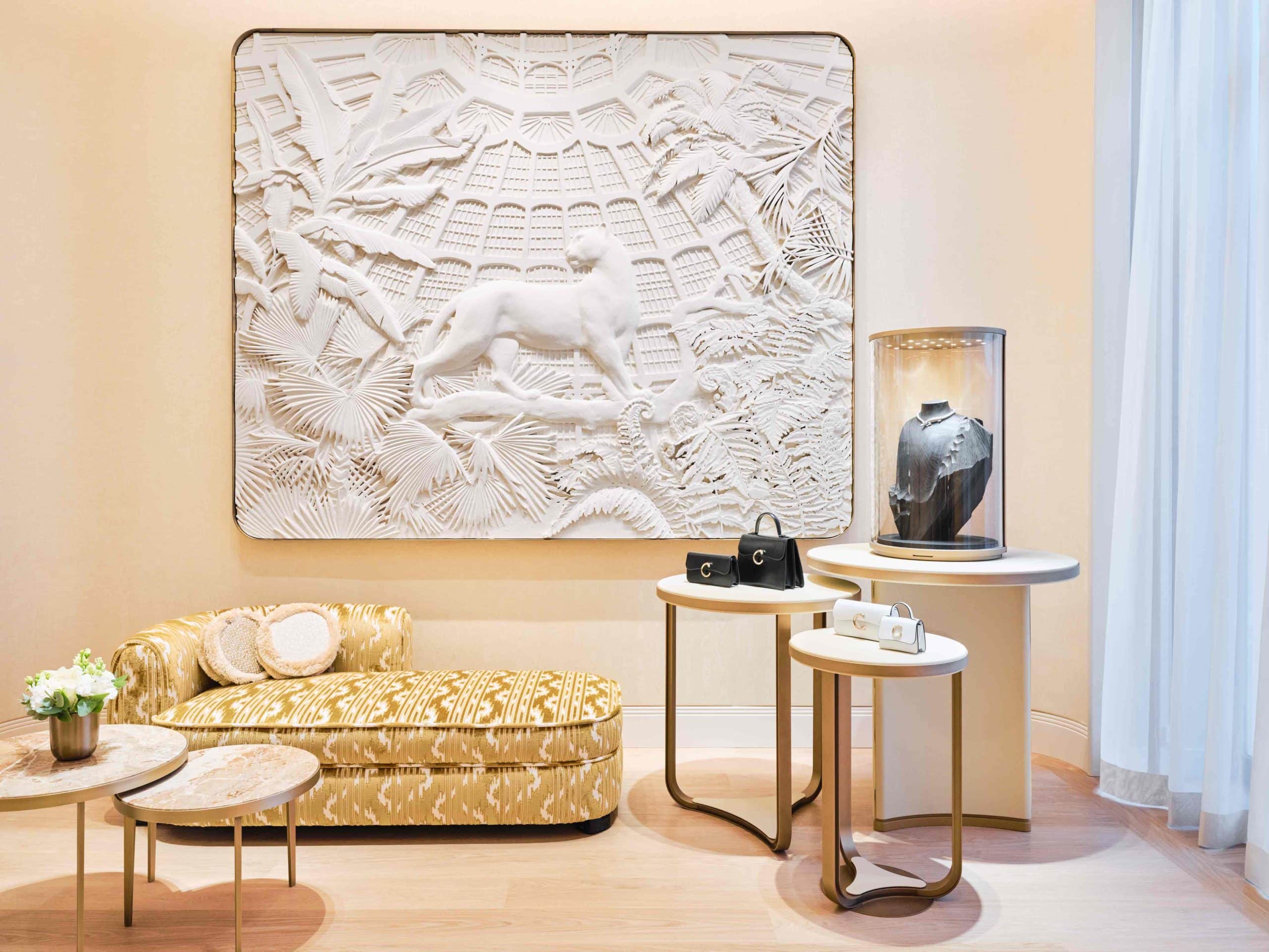 Inspirée par les Serres Royales de Laeken, une verrière laisse entrer une lumière naturelle, magnifiant les créations joaillières de Cartier. Au cœur de cette scénographie, une panthère en papier mâché, œuvre de l’Atelier Blundell & Therrien, prend vie dans un décor végétal. Du sol au plafond, chaque centimètre carré raconte l’histoire d’une Maison où l’artisanat est roi. « La nature a été le fil conducteur de cette boutique », expliquent les designers.