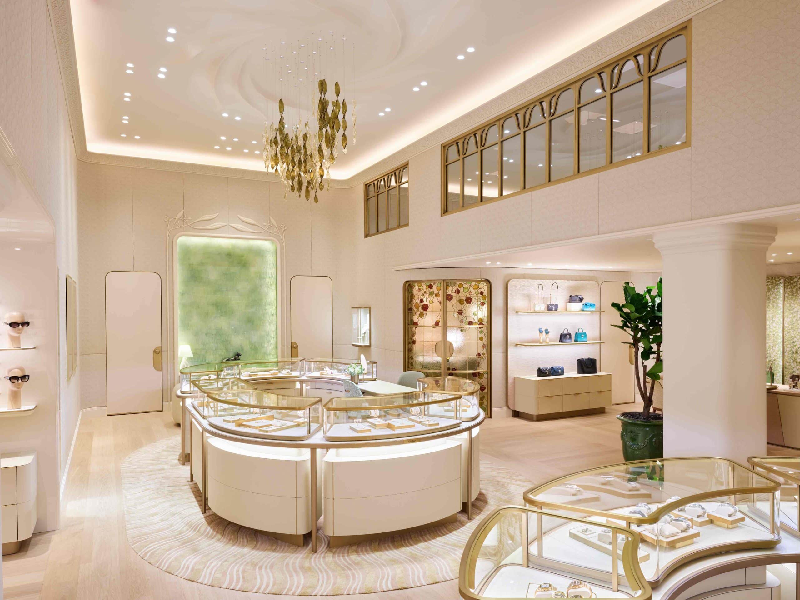 Les vitrines transparentes mettent en scène les créations iconiques, telles des œuvres d’art. Des montres légendaires aux bagues Panthère, chaque pièce est sublimée dans un cadre épuré. Le mobilier sur-mesure, aux lignes sobres et aux tons naturels, s’efface pour laisser scintiller les bijoux. Au centre, un lustre inspiré du bracelet Tutti Frutti de 1925 ajoute une touche féerique à cet écrin sensoriel.