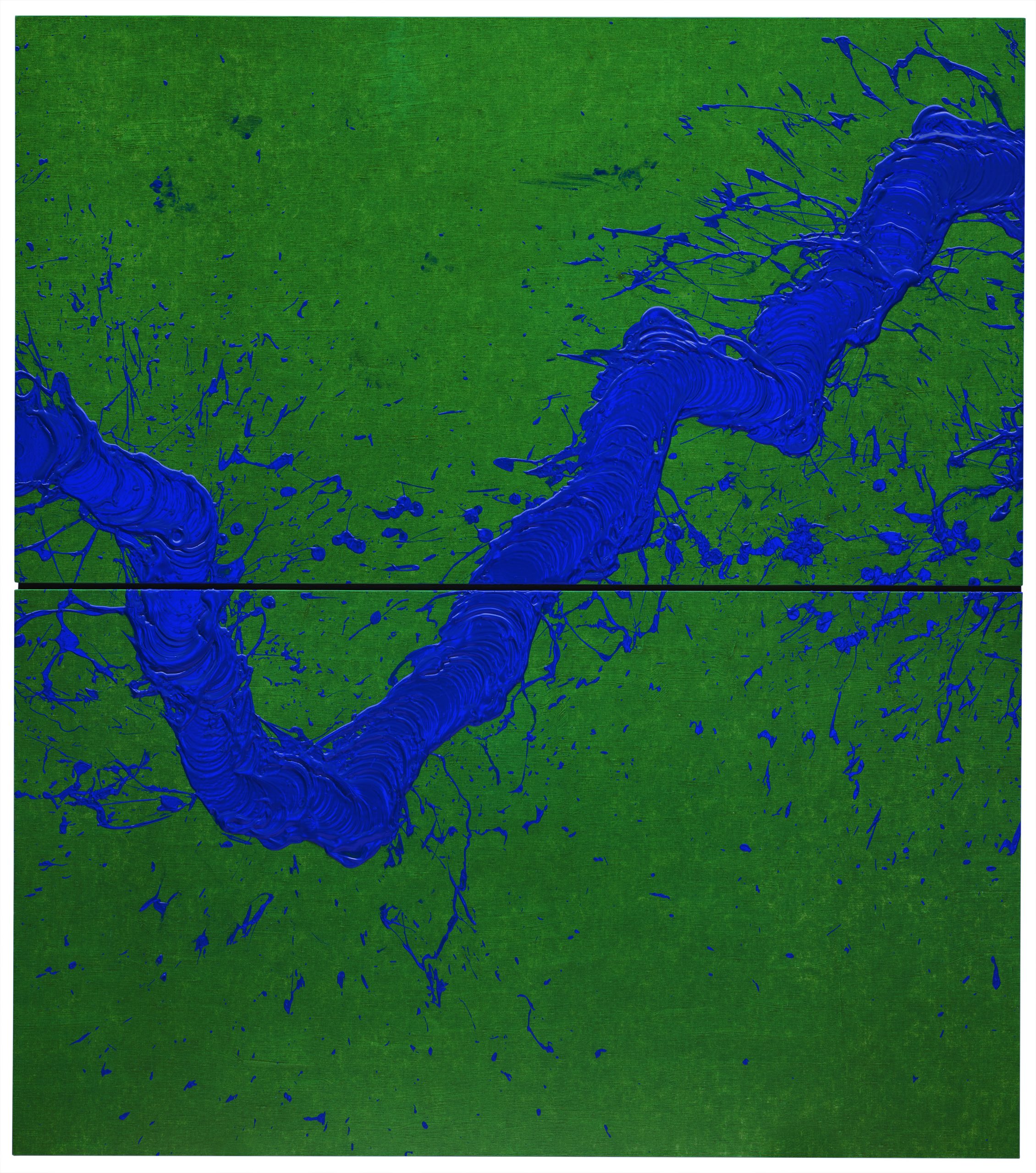 « Dans le cadre de cet accrochage, explique Edouard Derom, nous montrons son travail au pinceau inspiré par la calligraphie apprise en Chine, y compris au moyen de grandes brosses en crin de cheval accrochées par un système de poulies au plafond de son atelier. S’étant démis le bras à cause de leur poids, elle a évolué vers une technique de « walking painting » : elle marche autour de la toile munie d’un entonnoir d’où la peinture s’écoule, sans contact avec la toile. D’autre part, quelques œuvres sont inspirées de la nature, comme son Torrent de haute montagne. »