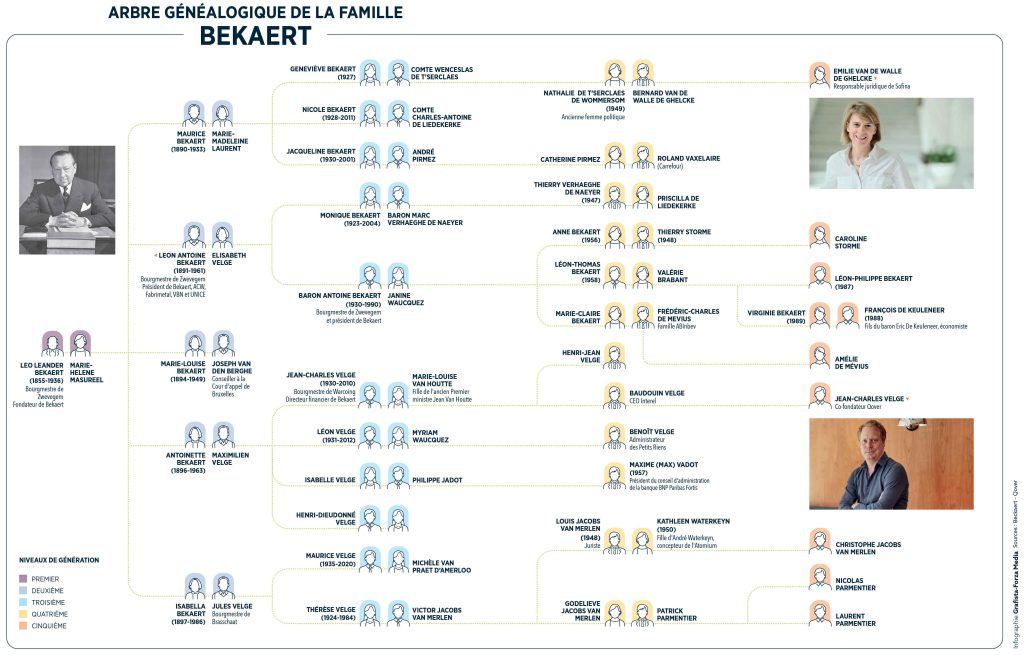 La troisième génération s’est concentrée sur les familles nobles pour étendre l’influence et le réseau de Bekaert, tissant des liens avec des lignées aristocratiques telles que les Liedekerke, les T’Serclaes de Wommersom, les Woot de Trixhe, les Beauffort, Cardon de Lichtbuer et van de Walle de Ghelcke.