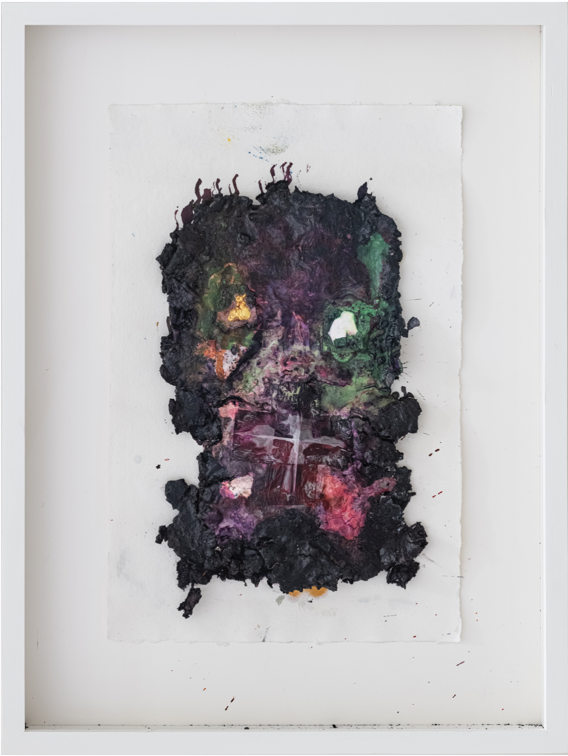 Guidé par Ann-Veronica Janssens devenue curatrice, David Mileikowsky expose des œuvres mutantes de son cycle De profundis. « Plus qu’une série de tableaux, c’est un voyage dans les profondeurs du labyrinthe de nos esprits », souligne-t-il. Voyage, le mot est juste : son accrochage évolutif change toutes les semaines : « J’ai voulu une exposition qui soit en vie : l’œuvre ne cesse de se créer, tous les jours ». Les lieux-mêmes en portent la preuve : sur le sol en béton, des taches de couleurs jalonnent les tableaux en finition, en mutation. « L’idée m’est venue de Turner. Lors de ses vernissages, où l’on apposait traditionnellement le vernis sur la toile enfin fixée, à la dernière minute, Turner fendait la foule muni de sa palette et de ses couleurs et ajoutait, par exemple, une note de rouge dans un tableau complètement vert. » David Mileikowsky manie quatre éléments fondamentaux (pigments naturels/eaux teintées/feux de bois/air pulsé) pour pétrir ses œuvres de couleurs et de matières (fiel de bœuf, de glanz teintés, cires, papiers de cigarettes froissés), « sous le regard du dieu Feu, grand révélateur des nuances cachées », scande-t-il de sa voix aux tonalités de Paolo Conte et d’Orson Welles.