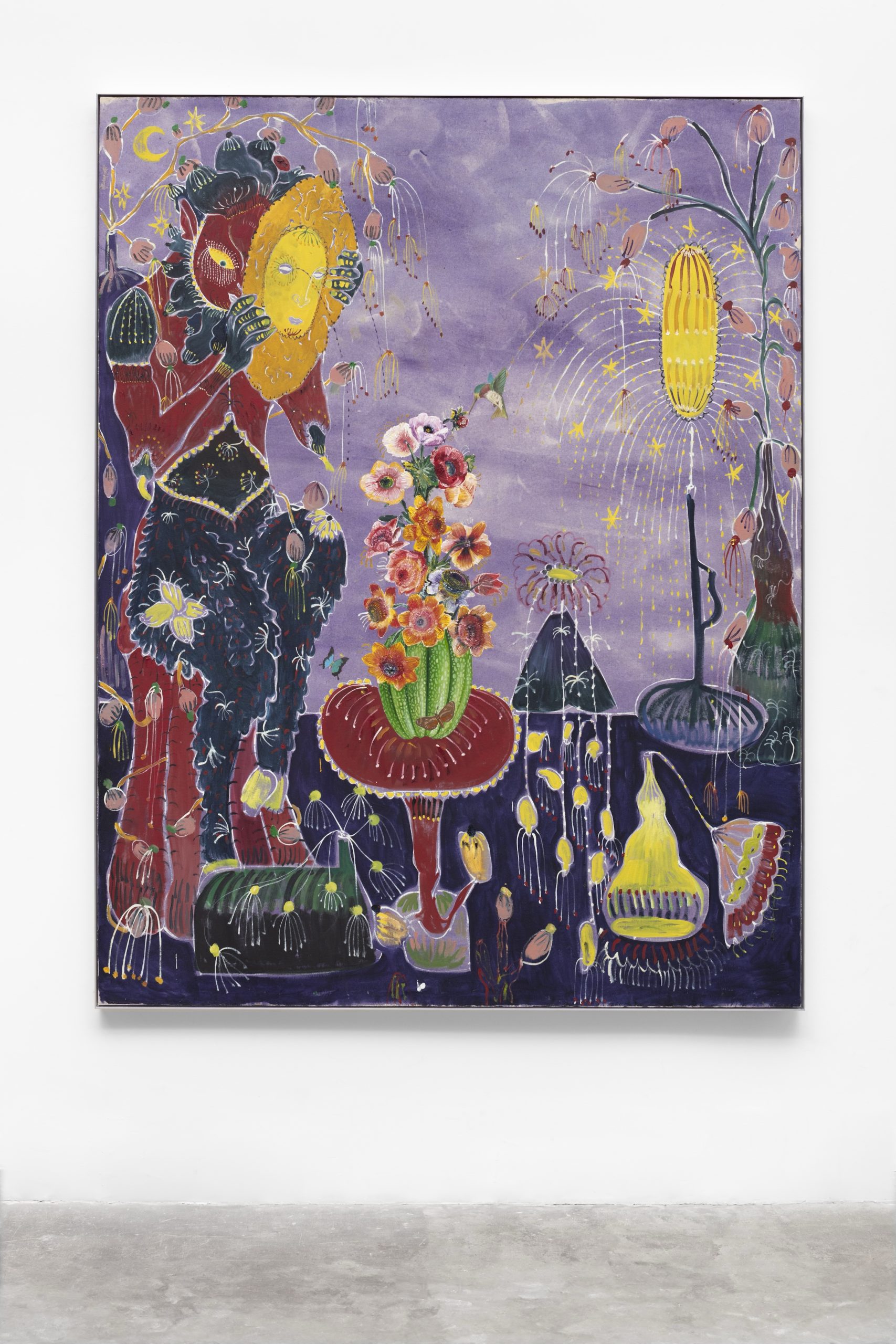 Représenté par la galerie Mendes Wood DM, le Brésilien Paulo Nimer Pjota (lauréat du Solo Prize Art Brussels 2024) expose à TheMerode. Il conjugue une iconographie de la culture populaire et de l’histoire de l’art à des visions de la culture urbaine. Cela le mène à associer des archétypes contreculturels à des éléments des sociétés gréco-romaines ou précoloniales. Représentations de plantes, mots isolés, figures de dessins animés, tatouages, griffonnages, emprunts aux natures mortes flamandes et hollandaises du XVIIe siècle, artefacts précolombiens et helléniques flottent dans la toile en constellations de formes suspendues.