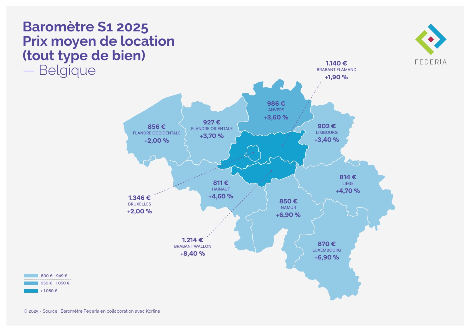 Dans le Brabant wallon, où le marché local est gagné par l’exode bruxelois, la surchauffe locative atteint même plus de 8% sur base annuelle, Wavre devenant le premier chef-lieu wallon à passer le cap symbolique des 1.000 euros mensuels hors charges. Mais la province de Namur, qui affiche au premier semestre 2025 une hausse moyenne de 7%, est déjà elle aussi la proie des locataires les plus mobiles.