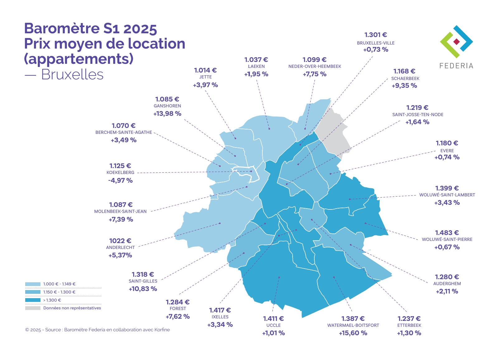 La nouvelle édition du baromètre des locations, réalisée en partenariat avec CIB et avec la collaboration de Korfine (analyse des données) repose sur les nouveaux baux locatifs enregistrés en Belgique depuis le début d’année. Et les constats engrangés sont préoccupants: si le loyer moyen pour les 19 communes de la capitale s’élève désormais à 1.346 euros par mois (hors charges) pour les nouveaux contrats, plus aucune commune bruxelloise n’affiche encore de loyer moyen inférieur à la barre des 1.000 euros pour un appartement.