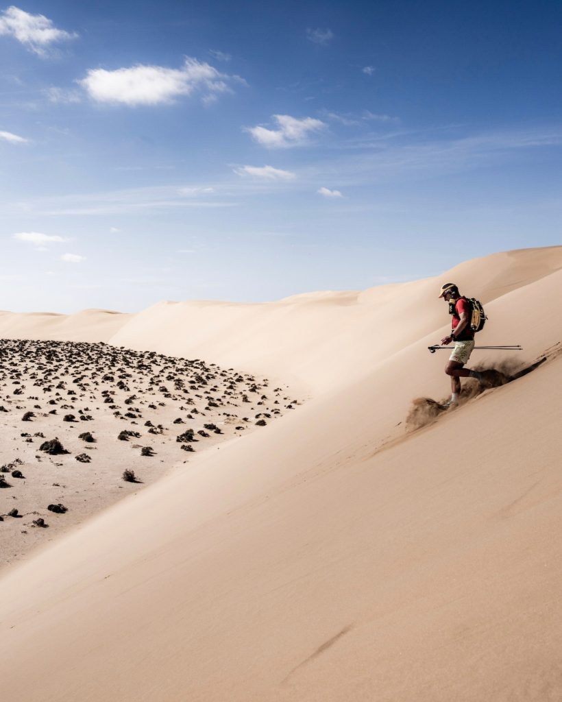 Six étapes, environ 270 kilomètres en autosuffisance alimentaire, des températures extrêmes, et un sac à dos contenant nourriture et matériel pour toute la semaine. Le terrain alterne dunes, plateaux caillouteux, djebels et oueds secs. L’étape la plus longue se court sur quarante-huit heures.