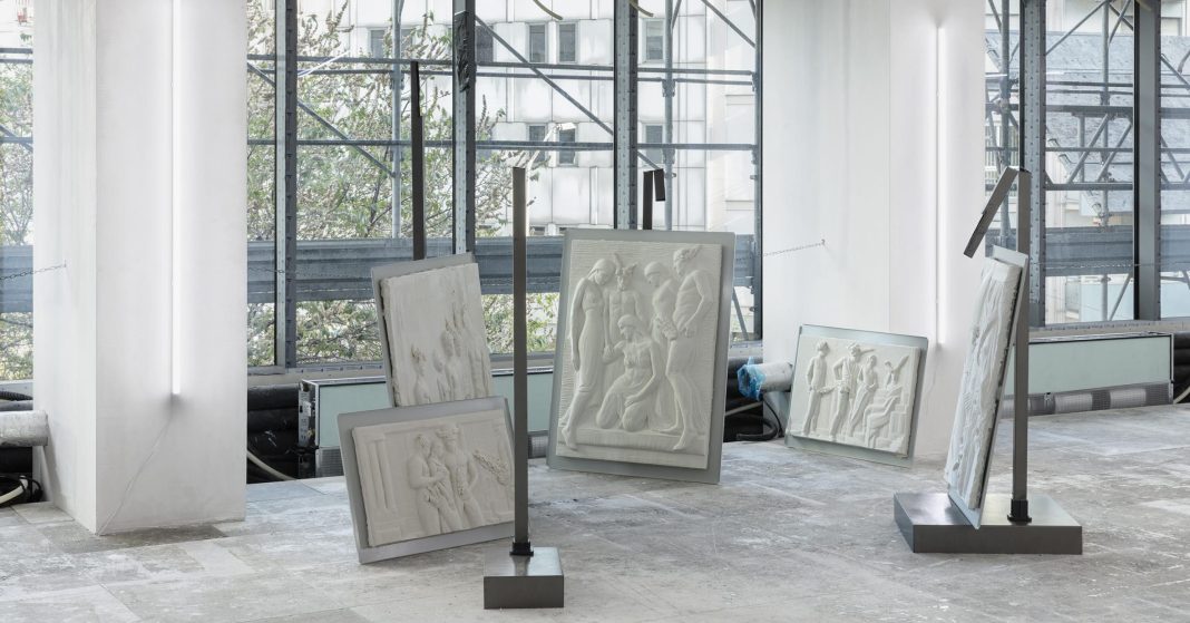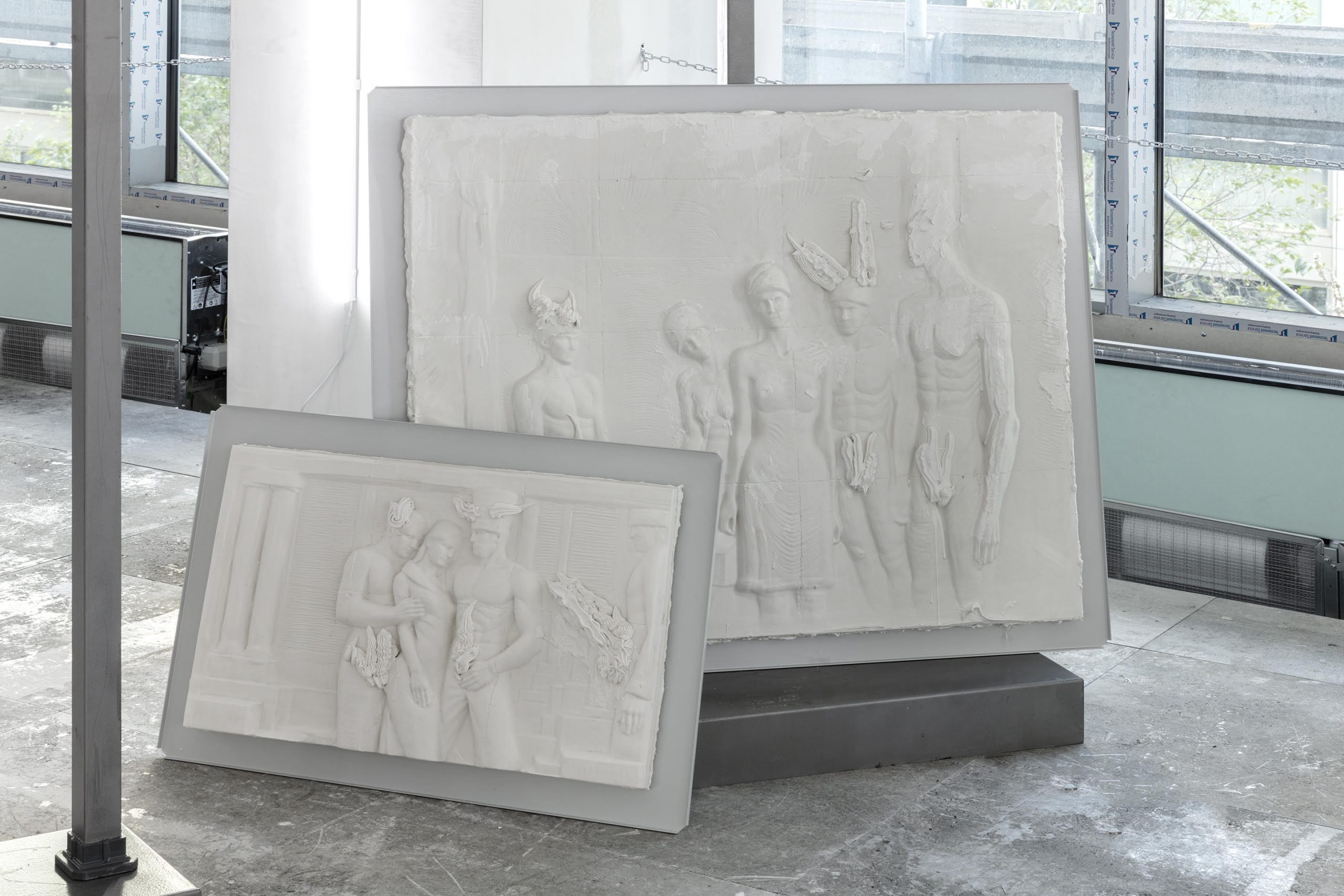 La galerie Keteleer, établie à Anvers, dirigée par Koen Leemans depuis 2023, est de la partie. Il a dirigé le Centre culturel de Malines de 2001 à 2023, en étant à partir de 2020 conservateur d’art contemporain au Musée Hof Van Busleyden et à De Garage. Il participe à cette première édition de Paris Internationale Milano en binôme avec la galerie milanaise Lia Rumma. Ils présentent l’ensemble La Tempesta de l’italien Luca Monterastelli, exploration du bas-relief, dispositif narratif urbain très présent en Italie, comme chacun sait, dès l’époque romaine. Sa série de panneaux en plâtre interprète les bas-reliefs fascistes omniprésents à l’extérieur et à l’intérieur de tant d’édifices italiens, mais remplace leur fonction de propagande par une imagerie pornographique, ce qu’il appelle « une grammaire des corps soumis ». Les panneaux portent des traces de vandalisation, et il ne les place pas en hauteur, mais au sol, comme la relique d’une autorité compromise.