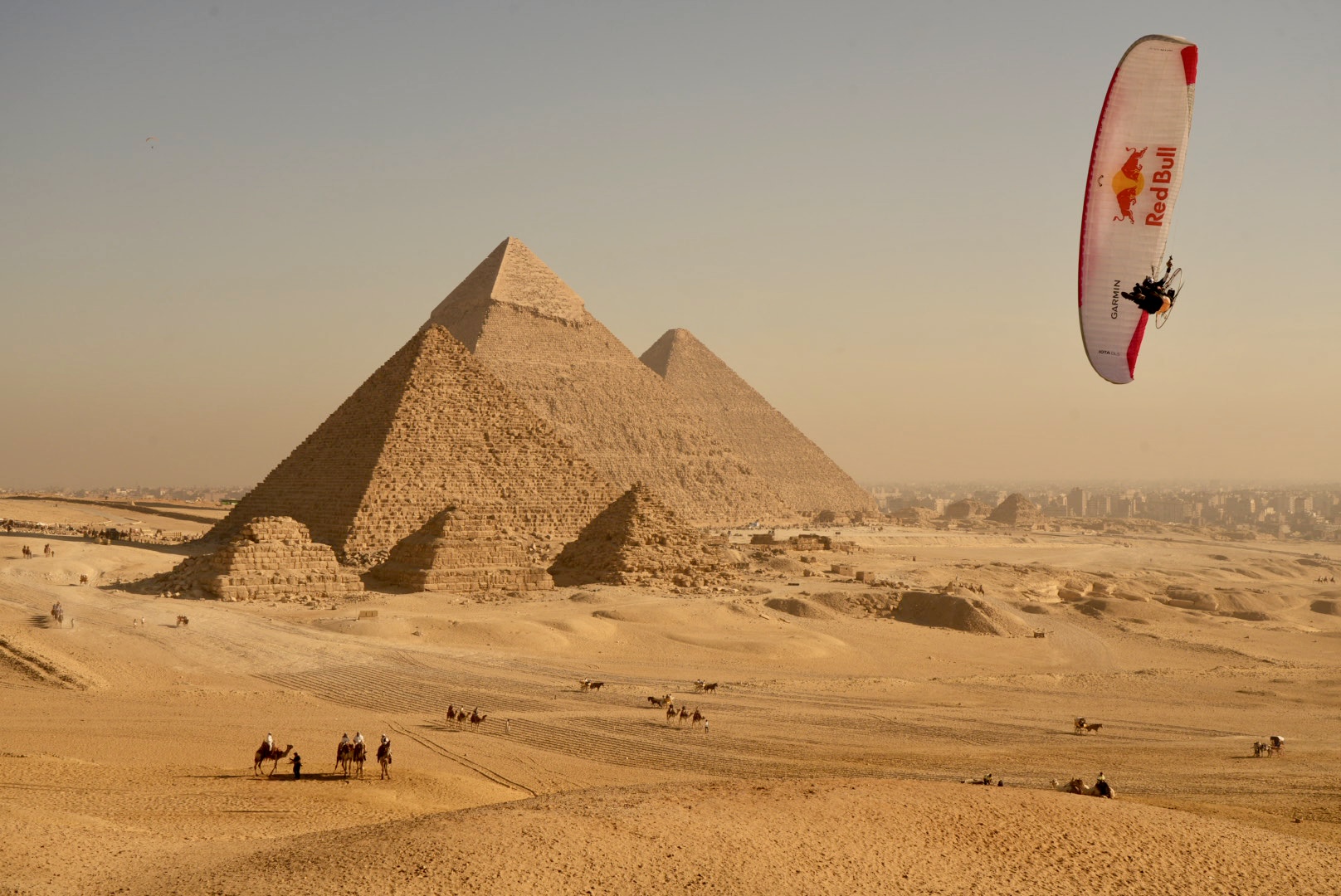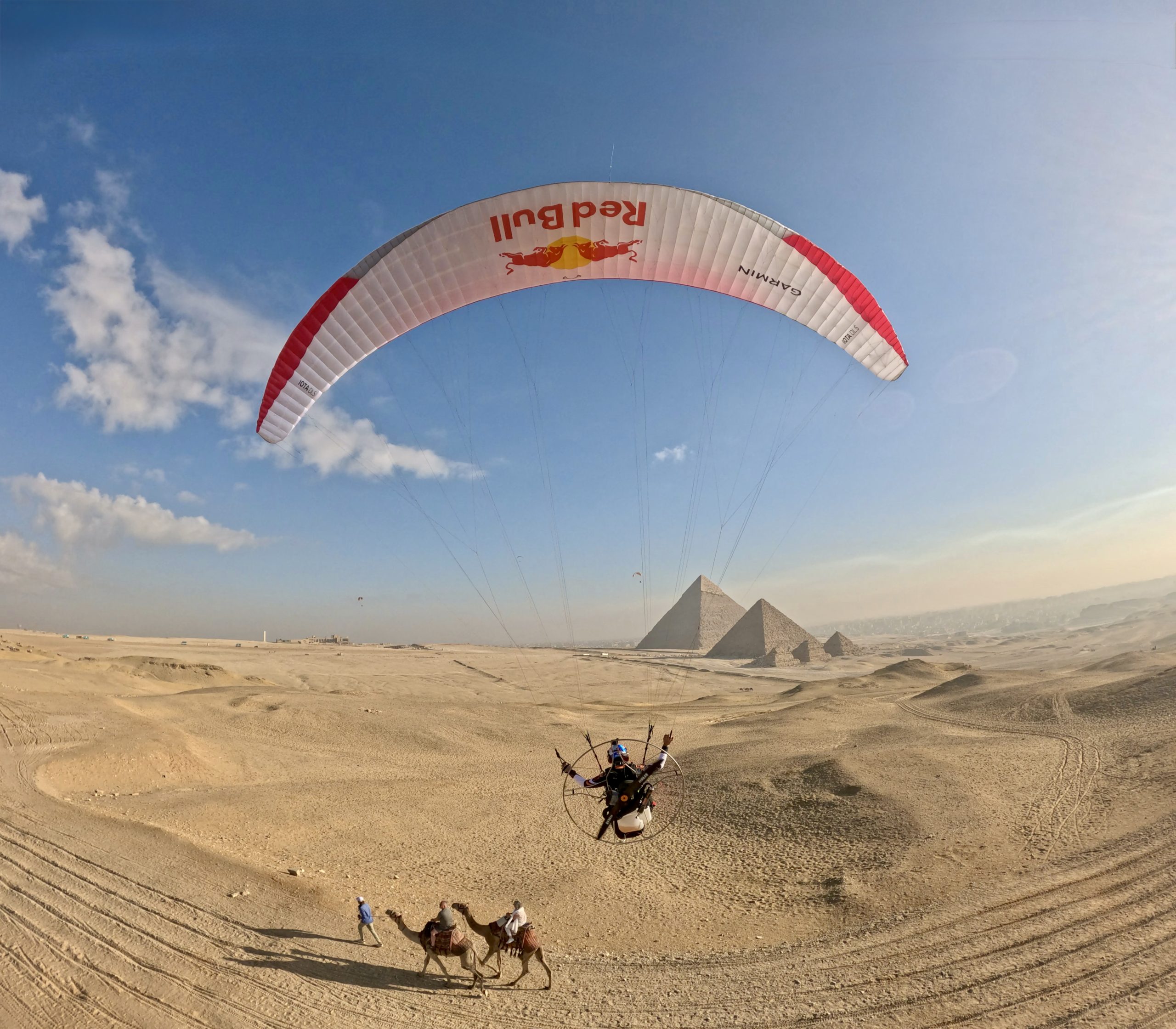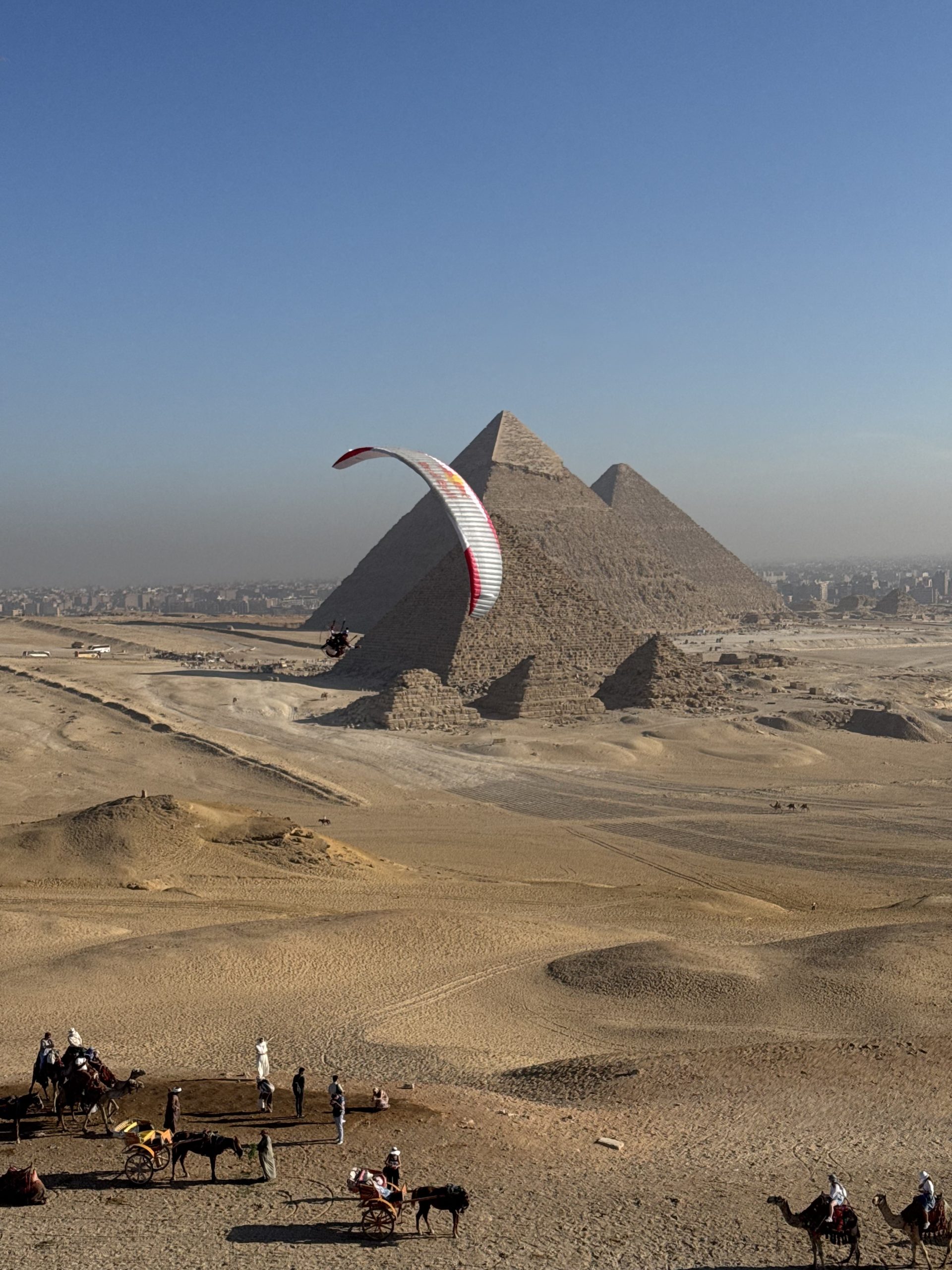 – C’était en effet vraiment particulier de voler au-dessus des pyramides. D’abord parce que c’était un vieux rêve, né de notre traversée du continent africain en 2012. À l’époque, il était impossible d’obtenir les autorisations nécessaires. Ensuite, ce furent des moments chargés en émotions parce qu’il y avait un petit côté retour aux affaires qu’on ne pensait pas fait dans de telles circonstances et conditions. Je trouvais important de continuer à réaliser des rêves. Finalement, c’est ton moteur quand tu es dans un creux de la vague, à l’hôpital : avoir un objectif, avoir un rêve, avoir quelque chose pour lequel se réveiller le matin. Ça m’a permis de traverser toute cette épreuve. J’avais cette envie de faire quelque chose d’assez visuel. Certains projets parapentes sont nettement plus techniques qu’un survol des pyramides. On les fait parce que ce sont des montagnes, parce que c’est le K2, parce que ce sont les Himalayas, parce que ça nous passionne, parce que ce sont des vols très techniques. Là, je savais que j’avais envie de partir sur quelque chose de plus visuel. Les pyramides ont quelque chose d’universel. Quand les gens voient survoler les pyramides, c’est quelque chose de vraiment exceptionnel. Techniquement, ce n’est pas ultra compliqué, mais c’est exceptionnel parce qu’on a ce sentiment d’exclusivité ultime, de pouvoir les voir du ciel. Tu as l’impression même qu’elles ont été construites pour être vues du ciel, tellement elles sont symétriques, alignées et massives. C’était vraiment exceptionnel de pouvoir y aller. En plus, on a eu l’autorisation de les survoler la nuit avec un éclairage. On a fait des images de nuit avec les voiles éclairées. On a fait des vols de nuit, des vols au lever du soleil à Gizeh et dans la vallée des rois, à Louxor. C’était juste exceptionnel.