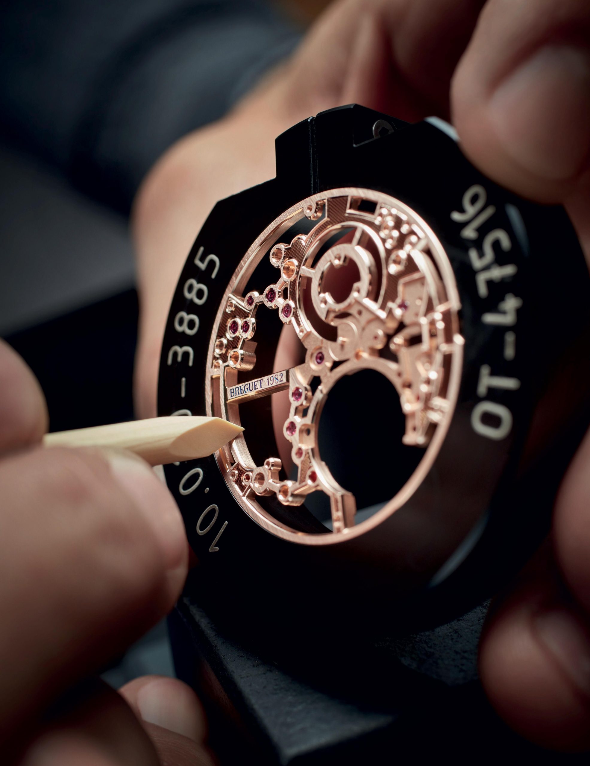 Uiteraard. Er worden al goede ideeën en bruikbare ontdekkingen uitgewisseld, zoals dat al eerder is gedaan. Ook al bevinden we ons niet op hetzelfde niveau in de piramide, bezit elk merk zijn eigen specifieke kenmerken en markten. En dan zijn er binnen de groep en aan de basis van deze piramide entiteiten die nieuwe materialen kunnen produceren – met name legeringen – voor alle merken. Het nieuwe Breguet-goud is bijvoorbeeld geïnspireerd op het goud van horlogemakers, bestaat uit een mengsel van goud, koper, palladium en zilver en maakt duidelijk gebruik van transversale knowhow. Daarnaast is er ook nog de magnetische spil, die vandaag een referentie is in de horlogewereld. We zijn trouwens één van de weinige horlogegroepen die de hele productieketen beheersen, inclusief, via het bedrijf Moebius, de oliën en vetten waarvan het belang in ons vakgebied te weinig bekend is.