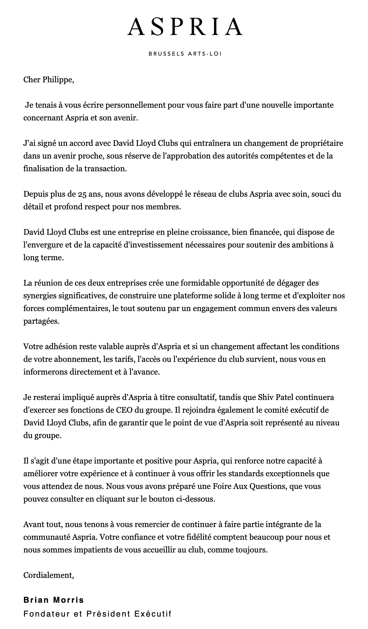 Ter herinnering, het merk Aspria werd opgericht door Brian Morris, een veteraan in de sector die onder andere de merken Riverside Racquet Centres, Espree Health en Harbour Clubs heeft ontwikkeld voordat hij ze in de jaren 90 verkocht. Hij richtte zich vervolgens op de Europese markt vanwege een non-concurrentiebeding en begon er met de ontwikkeling van het merk Aspria. Na het verzilveren van de verkoop van zijn portfolio, zal Morris niet geheel uit het zicht verdwijnen aangezien hij een adviesrol binnen de geconsolideerde groep zal behouden, terwijl Shiv Patel, de huidige CEO van Aspria die eerder bij David Lloyd werkte, de executive committee van David Lloyd Clubs zal vervoegen.