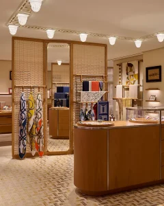 “De winkel met typische vakwerkgevels van kustcottages opent naar de wereld van zijde, waar een met rotan beklede bibliotheek interne vitrines onthult, die met de seizoenen veranderen. De ruimte voor parfums en schoonheid correspondeert met die van het huis en nodigt uit om te blijven hangen op bankjes in de erkers. De achterzijde van de winkel herbergt de ruitersportafdeling, modeaccessoires evenals de prêt-à-porter en schoenen voor heren, opgezet als een kleermakerssalon. Een met leer beklede leuning leidt de bezoeker naar de eerste verdieping, die tot de zoldering reikt. De prêt-à-porter en vrouwelijke schoenen vormen het hart, verlengd door een nis in warme kleuren gewijd aan lederwaren en juwelen. Op de hoek opent een privélounge naar een zonnig terras…” Je waant je er bijna!