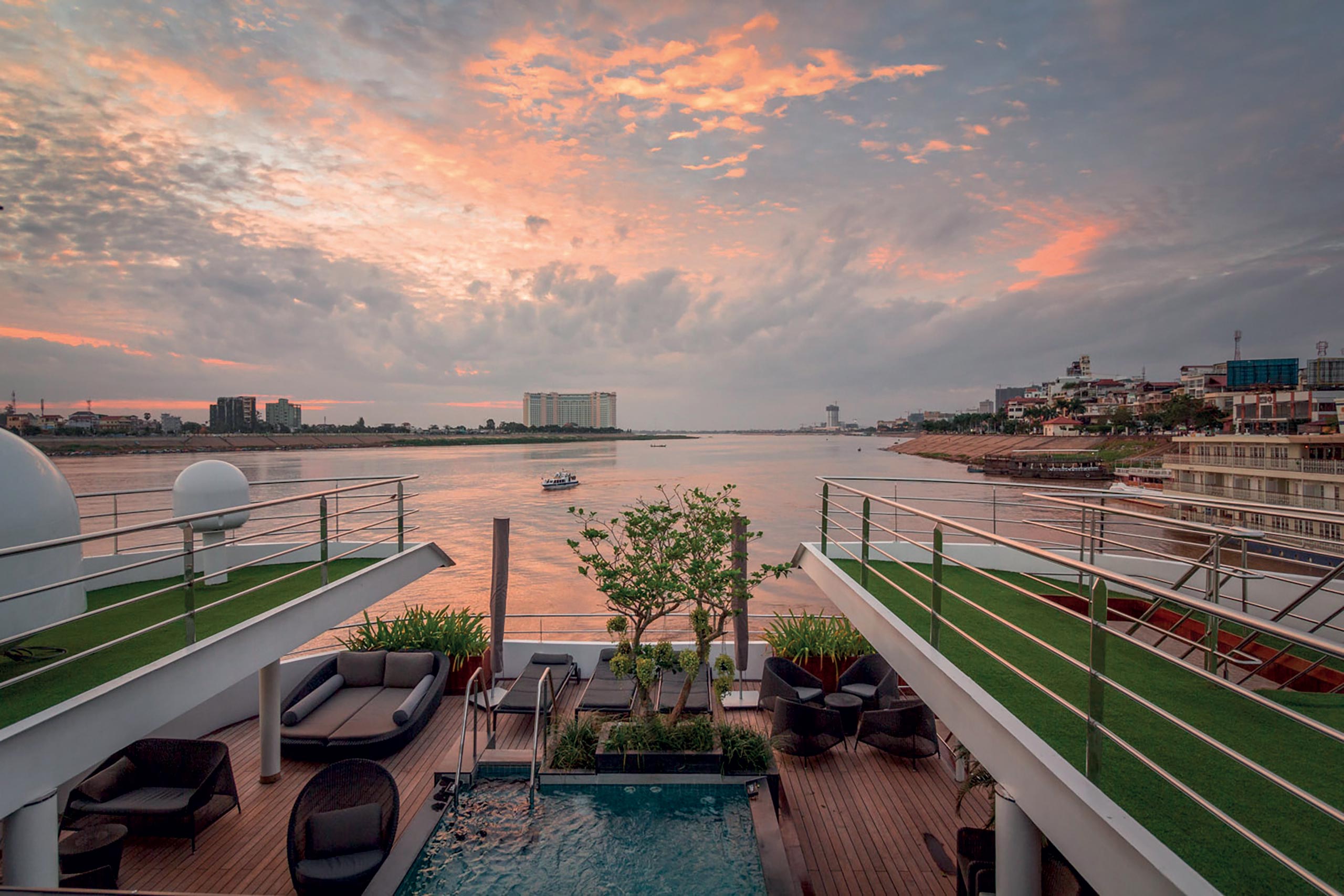 Bij zonsopgang kunnen vroege vogels op het dek yogales volgen met uitzicht op het voorbijglijdende water en de ontwakende dorpen. Sportievelingen leven zich uit in een compacte fitnessruimte naast de spa, waar behandelingen — verrassend betaalbaar — wellnesstradities toepassen uit de landen die we doorkruisen. Het keukenteam zorgt voor een evenwicht tussen westerse specialiteiten en traditionele Vietnamese en Cambodjaanse gerechten. Zo vloeien smaak en beleving naadloos in elkaar over.