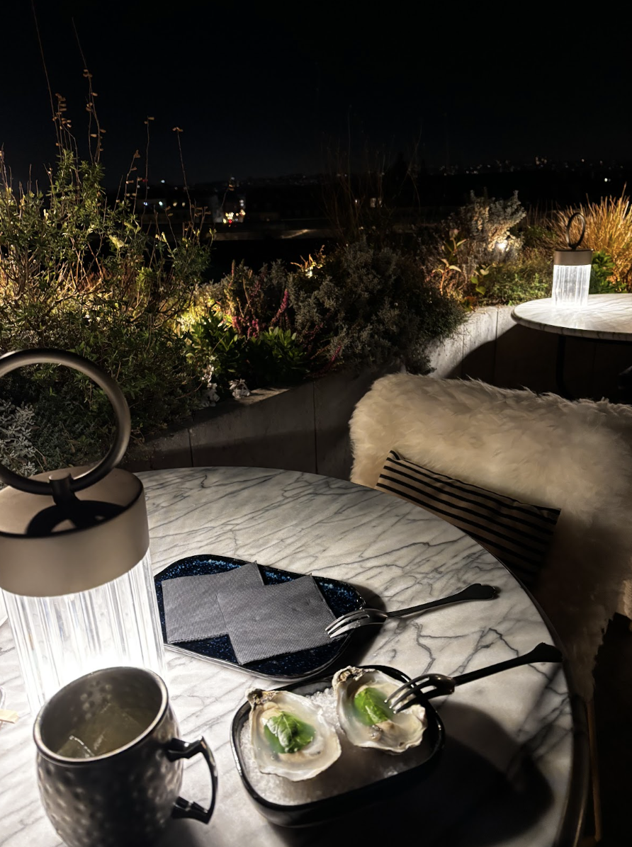 Het aperitief bij de Tour d’Argent, op het rooftop dat voor het eerst in de winter geopend is (gebruikelijk alleen in de zomer), geniet van de rijke geschiedenis van een huis dat in 1582 werd gesticht. Yannick Franques, Meilleur Ouvrier de France sinds 2020, regisseert een tijdloze elegante ervaring. De Champagne Blanc de Blancs Grand Cru Tour d’Argent, oesters in gelei en warme seizoencocktails speciaal voor de feestdagen gecreëerd, harmoniëren met de weerspiegeling van de rivier en de silhouet van de Notre-Dame. Het uitzicht omarmt Parijs-Sorbonne en de eilanden, en biedt een zeldzaam panorama van de hoofdstad in de winter.
